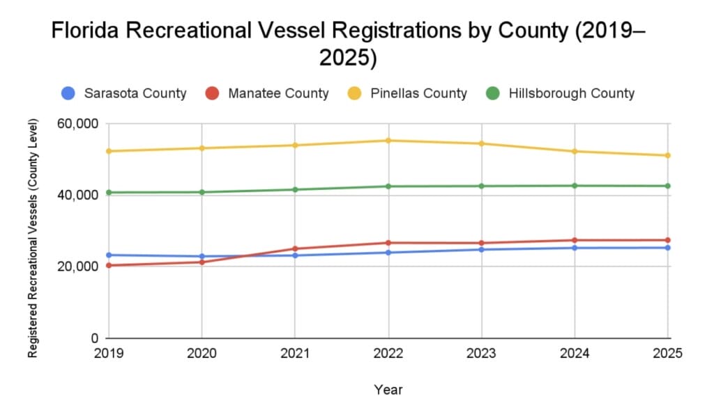 This chart shows recreational vessel registrations across select Florida coastal counties using publicly available Florida HSMV county-level data from 2019 through 2025. County registrations provide a verifiable indicator of sustained boating participation over time [1].